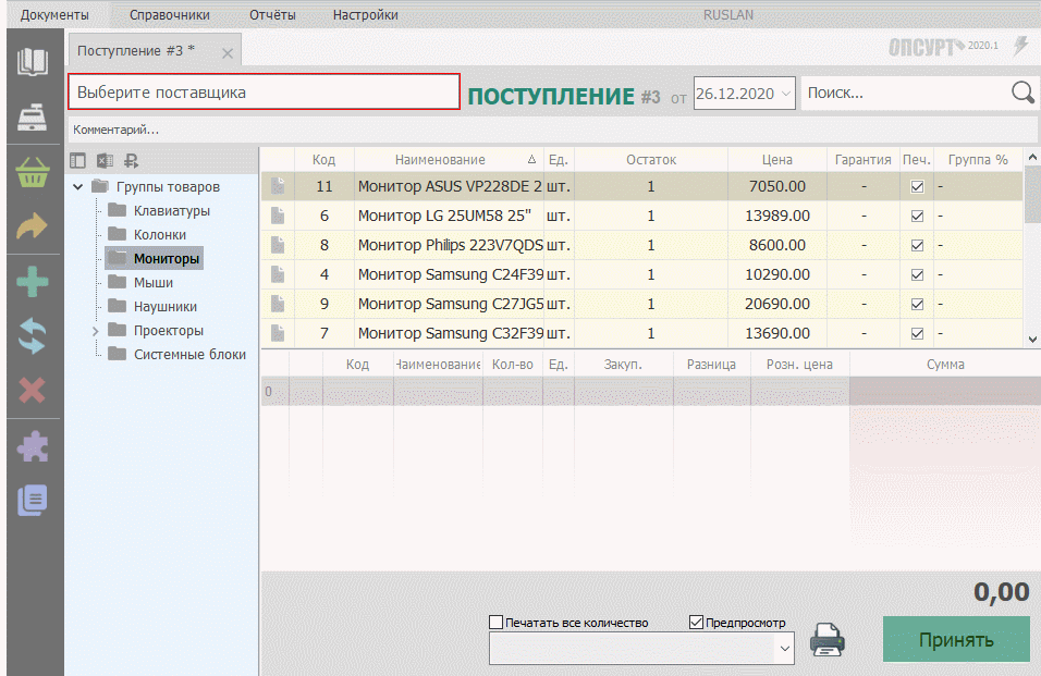 - Приём — с помощью сканера штрих-кодов или накладных товары быстро ставят на приход.