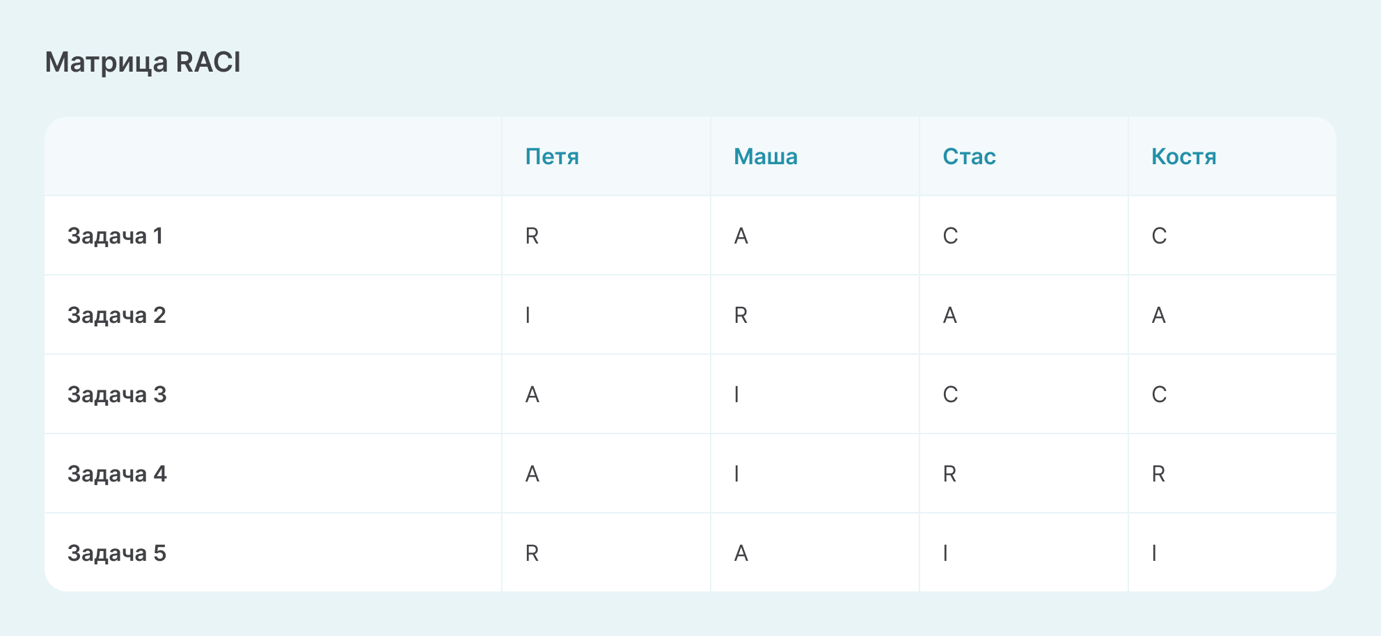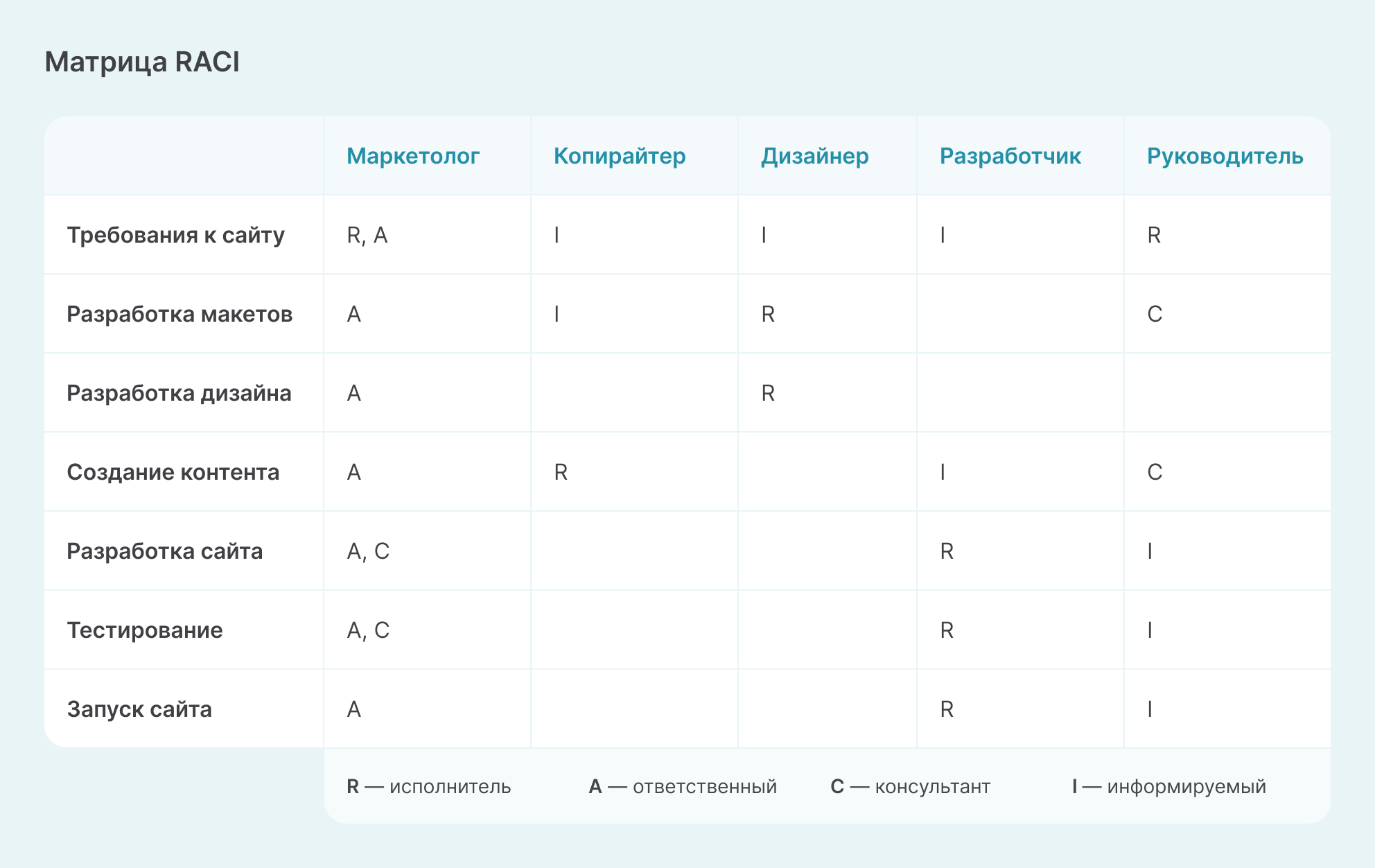 RACI, матрица ответственности — инструмент, который используют, чтобы обозначить роли сотрудников на проекте. Для этого делают простую таблицу: слева пишут список задач, справа — исполнителей. С помощью букв R, A, C, I обозначают роль каждого исполнителя, отсюда и название матрицы.