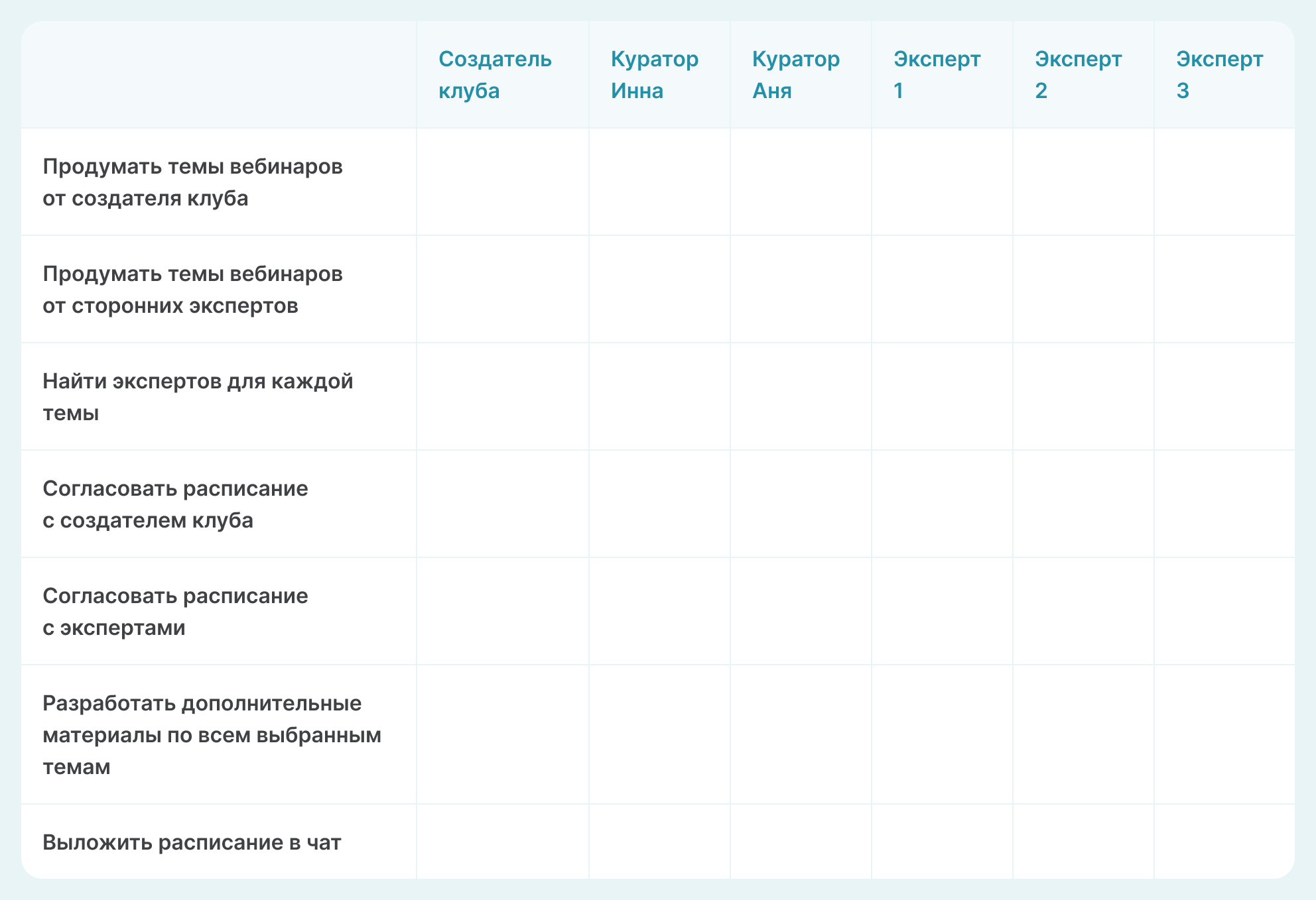 В нашем примере участниками будут создатель клуба, два куратора, которые занимаются организацией, эксперты. Всех участников записываем в таблицу, должно получиться так: