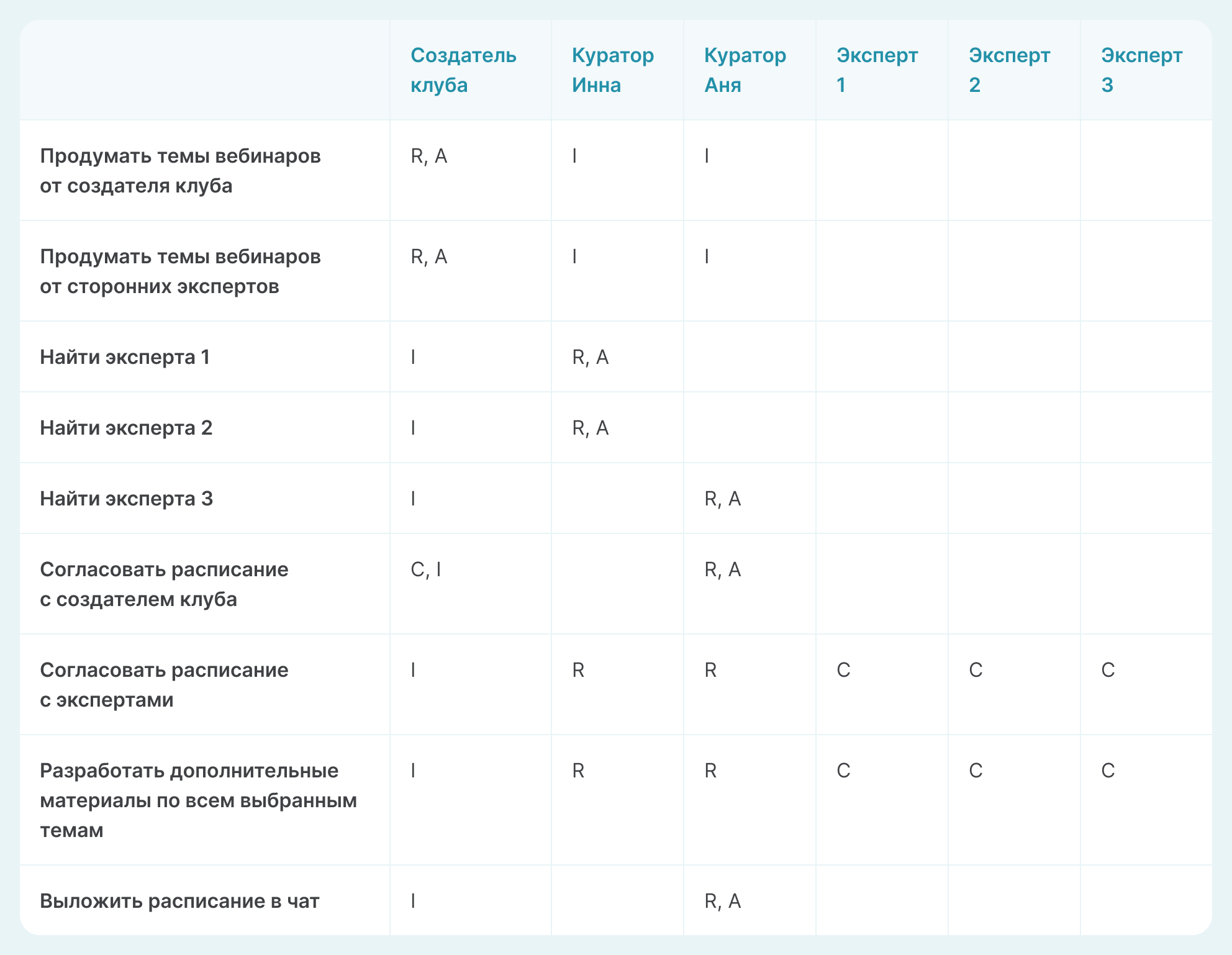 - Посмотрите, есть ли у участника A и R роли. Если их нет совсем, подумайте, можно ли обойтись без сотрудника на этом проекте. Например, у экспертов из примера выше нет этих ролей, но их точно нужно привлекать к работе — расписание без них не составишь.