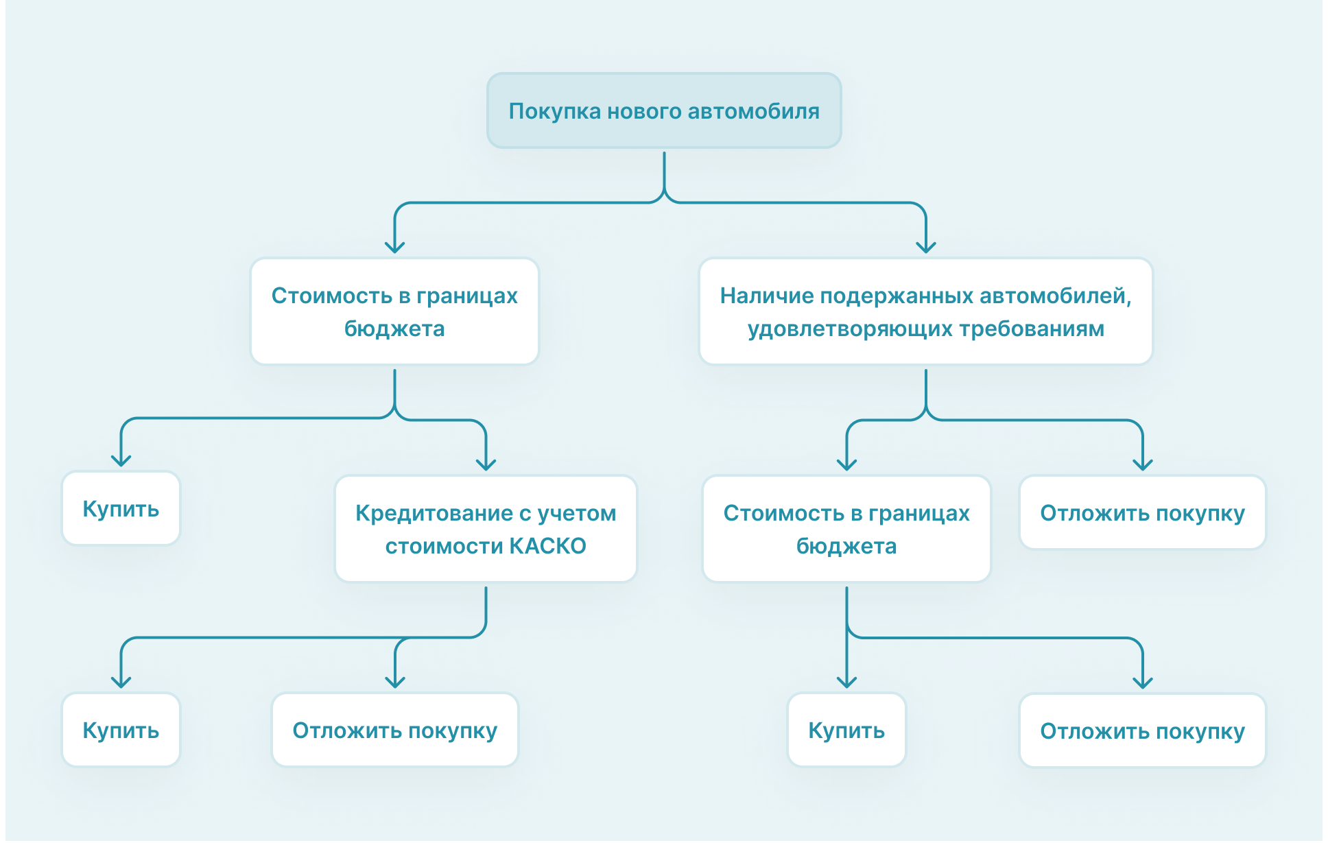 Например, необходимо принять решение о закупке корпоративного автомобиля. На первоначальном этапе менеджер определяет, будет ли этот автомобиль новым или следует рассмотреть вариант покупки подержанной техники. Далее следует понять укладывается ли покупка в утвержденный бюджет затрат.