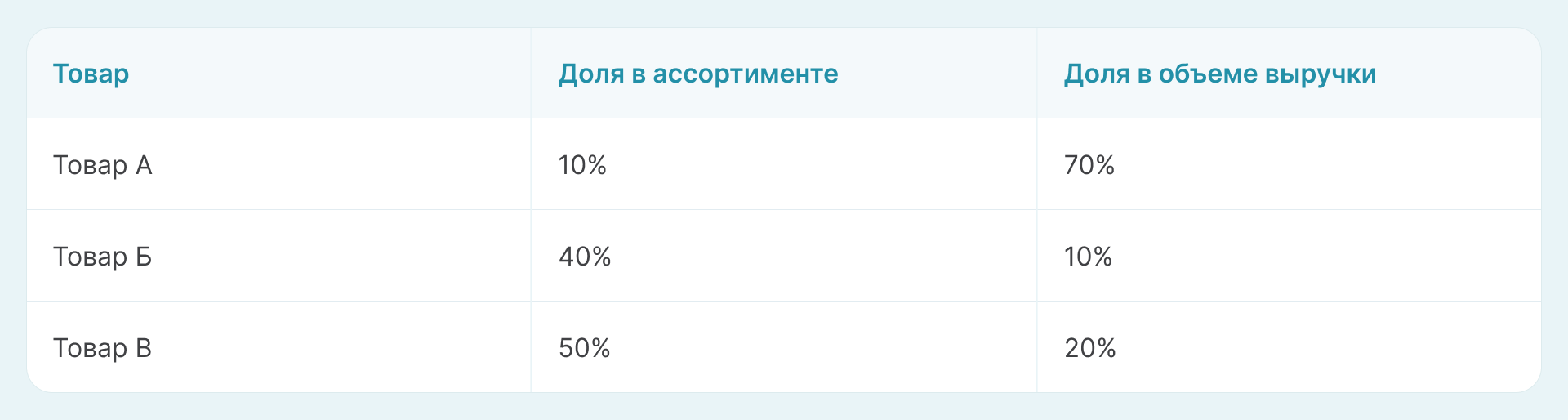 Оказалось, что наибольшую долю в выручке занимает Товар А, а Товар Б, хотя и занимает большую долю в ассортименте, но приносит всего 10% выручки. Менеджер решает распродать Товар Б и отказаться от его закупки в дальнейшем. Он расширяет долю Товара А в ассортименте и ставит задачу поэкспериментировать с закупкой нового продукта.