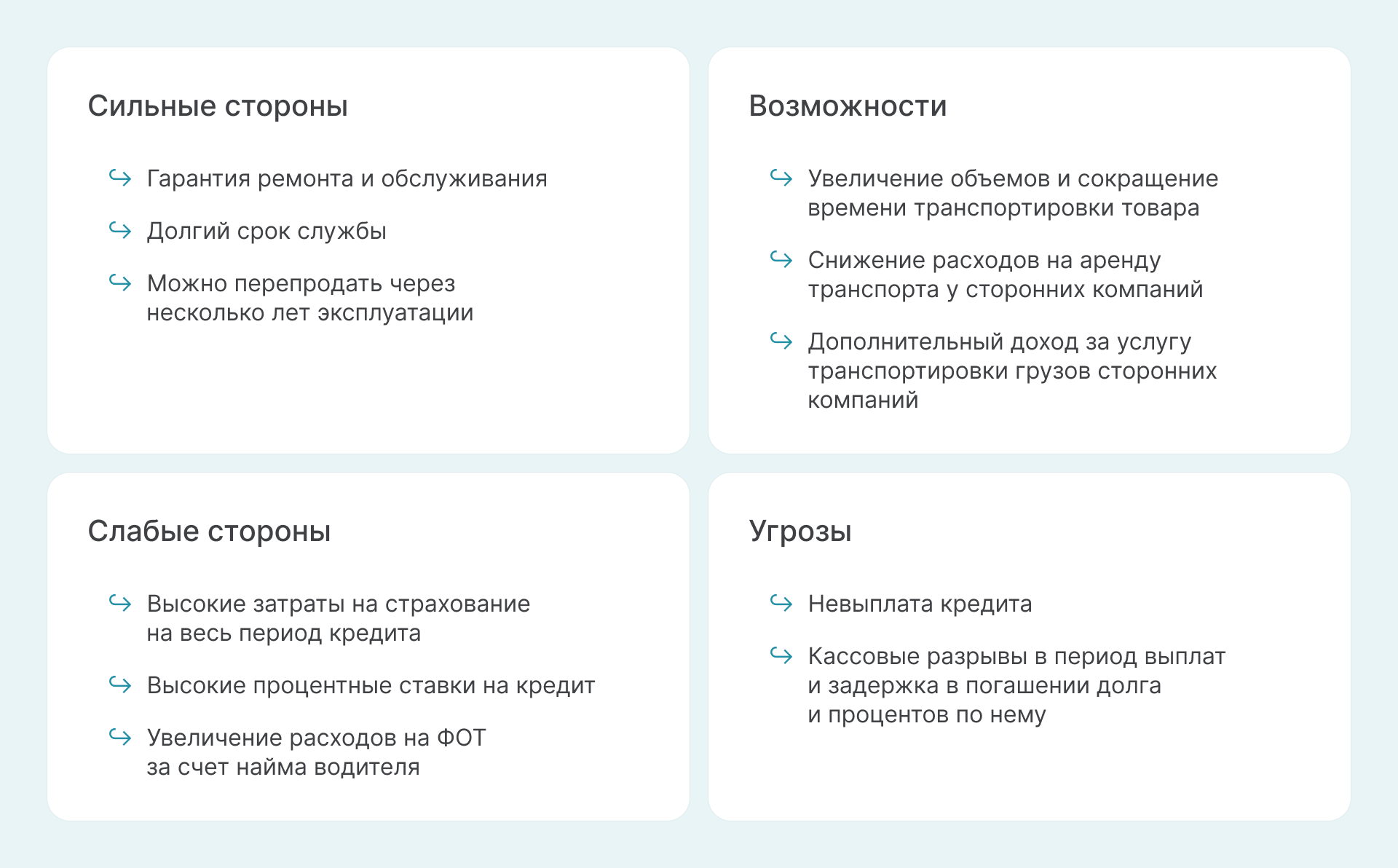 Например, для примера о покупке коммерческого автомобиля проведем простой SWOT-анализ варианта покупки нового автомобиля в кредит.