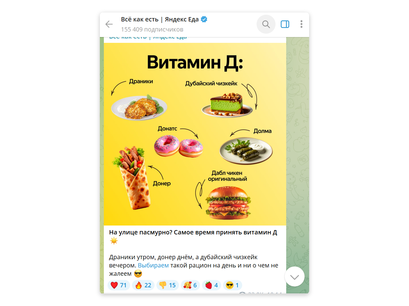 Трендовые события встраивают также в рекламу блюд, которые можно заказать в сервисе доставки. Например, вот как в компании обыграли получение витамина Д летом ↓
