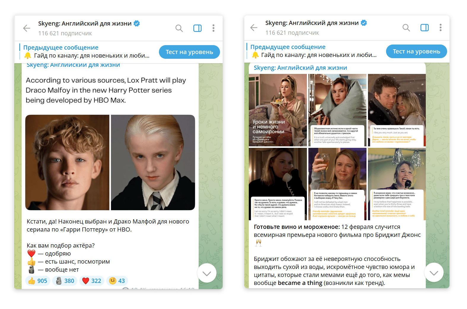 Тему Гарри Поттера и других зарубежных произведений команда использует и в своих соцсетях. Например, эсэмэмщики выкладывают посты с новым актером на роль Драко Малфоя или анонсируют выход фильма про Бриджит Джонс. Статью с Дзена ребята упаковали в карточки и тоже выложили в свой телеграм-канал.