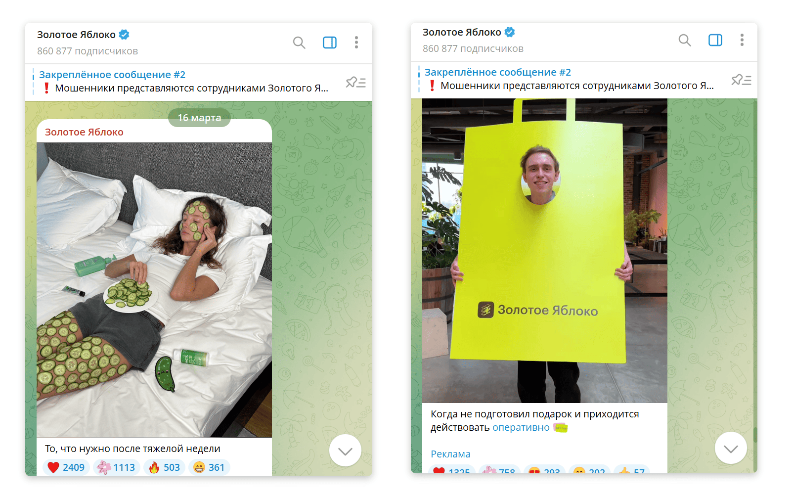 Например, эсэмэмщики «Золотого яблока» в соцсетях постят не только подборки товаров, бьюти-лайфхаки, полезные посты. Они также делятся мемами и смешными роликами, которые набирают много реакций и комментариев.
