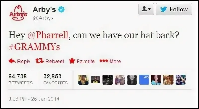 В начале 2014 года бренду нужно было как-то привлечь внимание молодежи. Чтобы привлечь внимание целевой аудитории и изменить позиционирование сети ресторанов, в компании решили включиться в события поп-культуры через социальные сети. Церемония «Грэмми» 2014 года стала для Arby's удачным случаем, чтобы использовать соцсети и начать диалог с молодой аудиторией. Певец и автор песен Фаррелл Уильямс появился на церемонии «Грэмми» в горной шляпе, похожей на шляпу с логотипа Arby's — компания ухватилась за этот шанс.