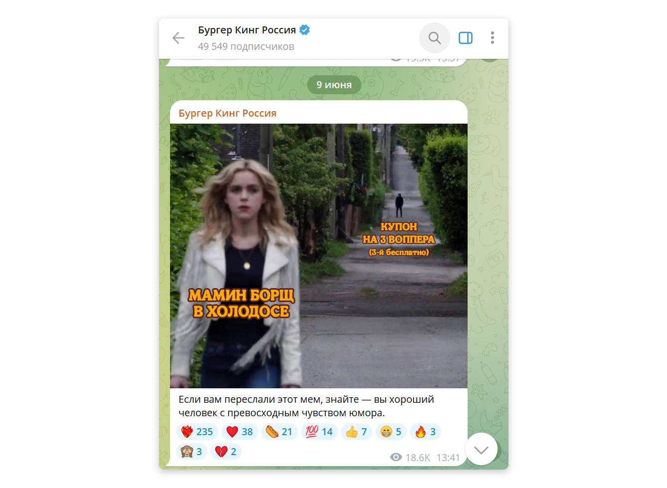 В Бургер Кинг любят инфоповоды и активно используют их для создания контента. Например, возьмем телеграм-канал компании. Каждый день и через день эсэмэмщики публикуют в нем мемы и смешные ролики ↓