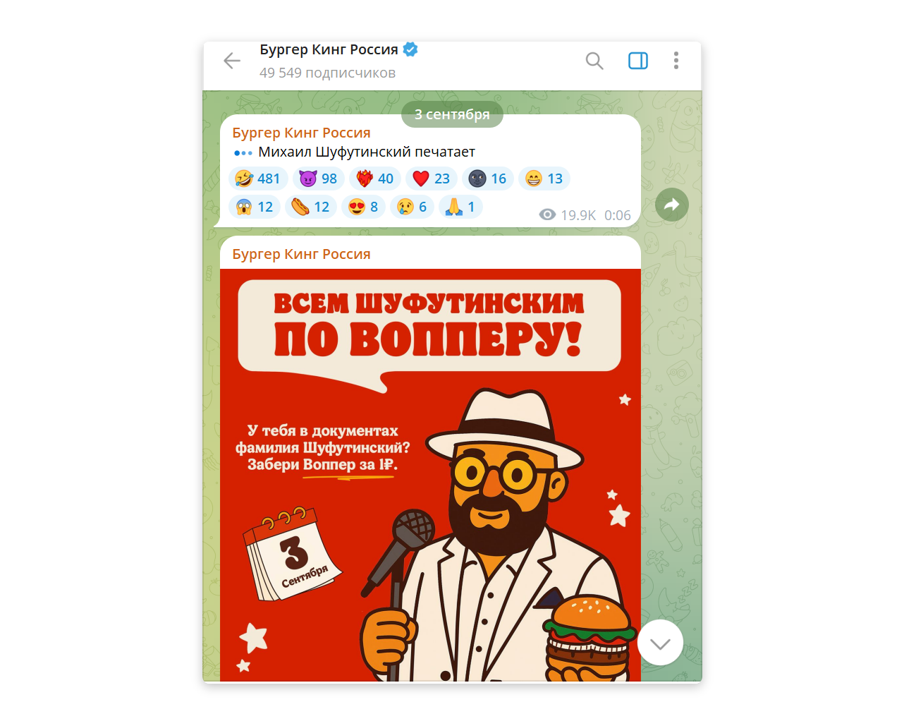 Но не обходится и без контента по случаю каких-то знаменательных дат. Так, в Бургер Кинг не смогли обойти вниманием 3 сентября, день, когда горят костры рябин…