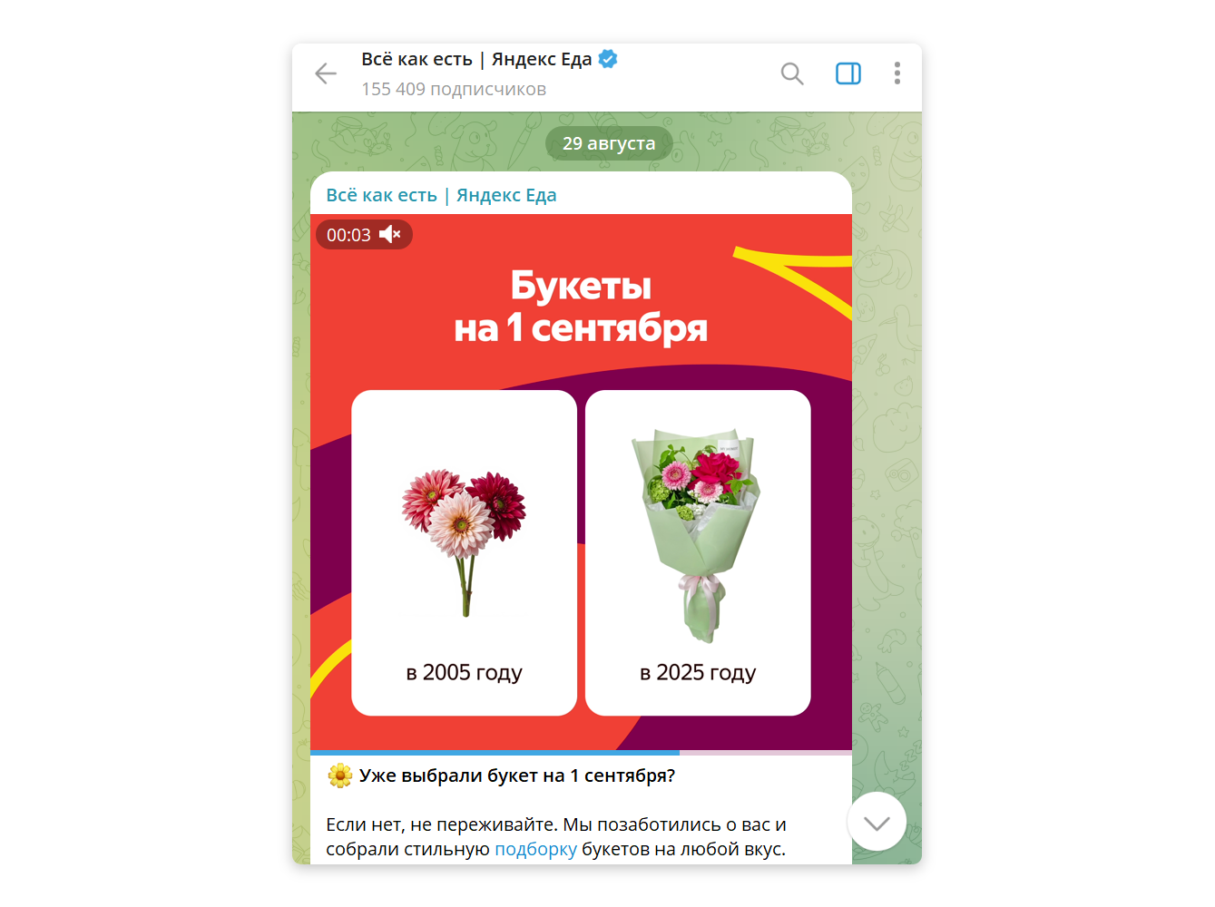 В Яндекс Еде ситуативный маркетинг используют филигранно. Здесь есть и мемы, и инфоповоды, посвященные, например, 1 сентября. При этом эсэмэмщики не забывают, что такую важную дату можно совместить в рекламой ↓