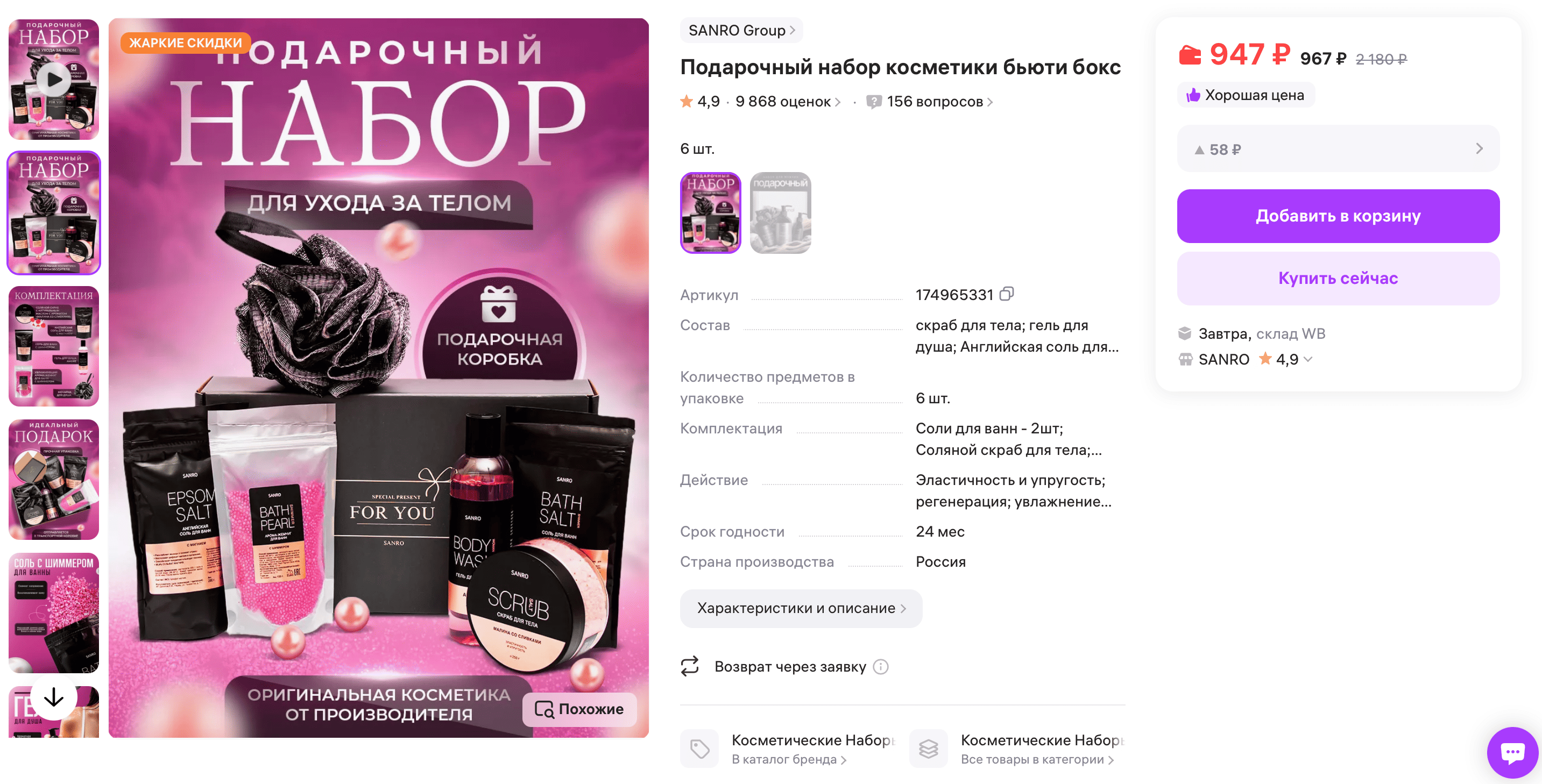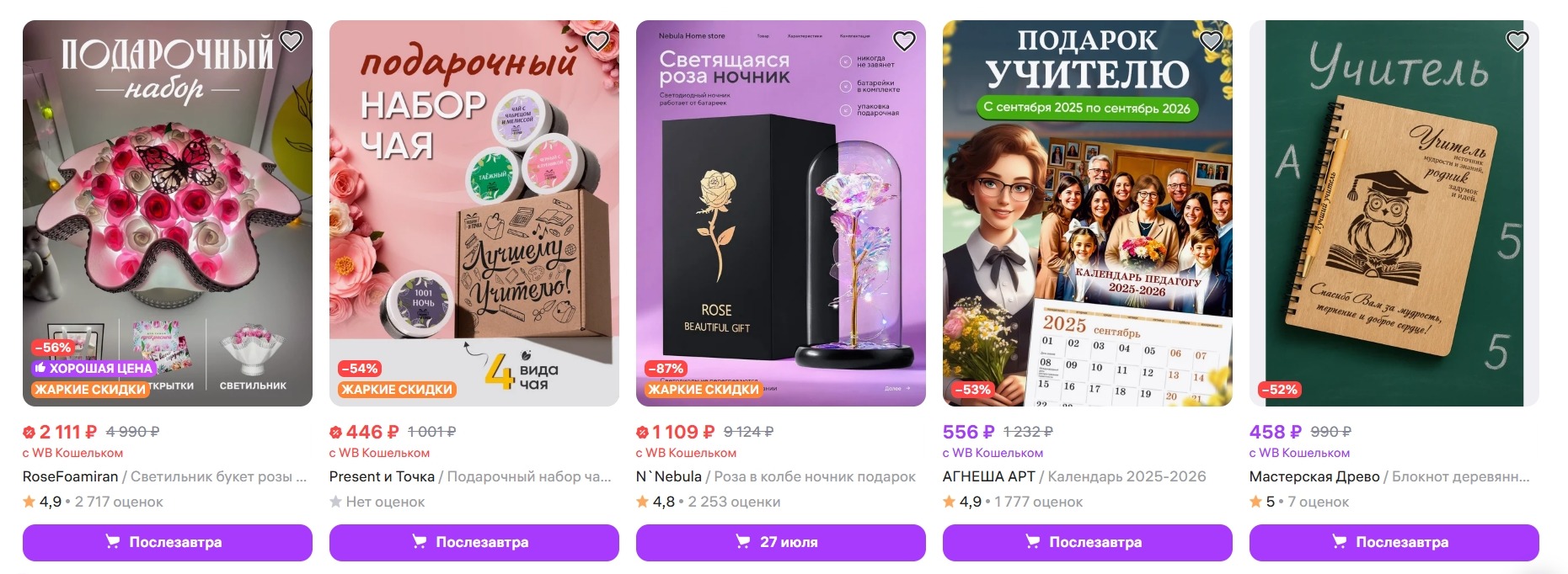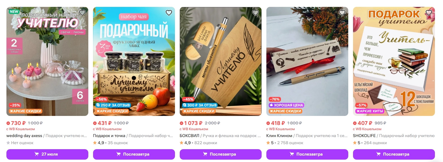 Также люди заказывают готовые подарочные наборы: косметику, бомбочки для ванн, наборы для рукоделия, свечи. Популярны готовые наборы для мужчин, женщин, под специальные профессии. Подарки часто ищут с помощью запросов «подарок папе на день рождения» или «подарок на день учителя».