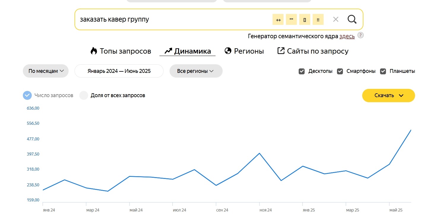 Тенденции роста можно увидеть, если проанализировать популярные запросы в поисковых сетях. Например, в сервисе Яндекс Вордстат видно динамику запросов. Люди вводят фразу «заказать кавер-группу» чаще, чем в 2024 году. Поиск кавер-групп максимально вырос в июне 2025 года.