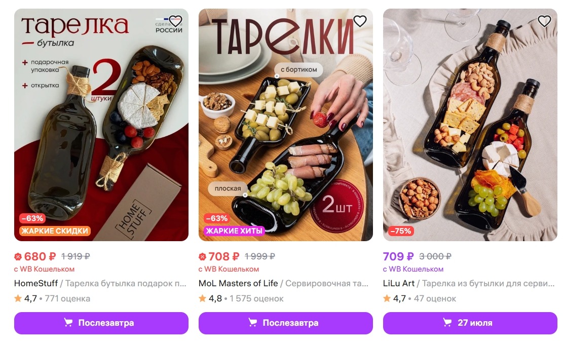На иллюстрации к первой карточке обозначено, что в комплекте две тарелки, а к ним прилагается упаковка и открытка. На второй также обозначено количество тарелок, характеристики «плоская» и «с бортиком». На третьей иллюстрации непонятно даже, сколько тарелок входит в комплекс, есть ли какие-то приятные дополнения вроде открыток, но цена самая высокая. Кто-то из покупателей прочитает описания из всех карточек, чтобы выбрать лучший вариант. А кто-то добавит в корзину ту карточку, в которой с первого взгляда нашел нужную информацию.