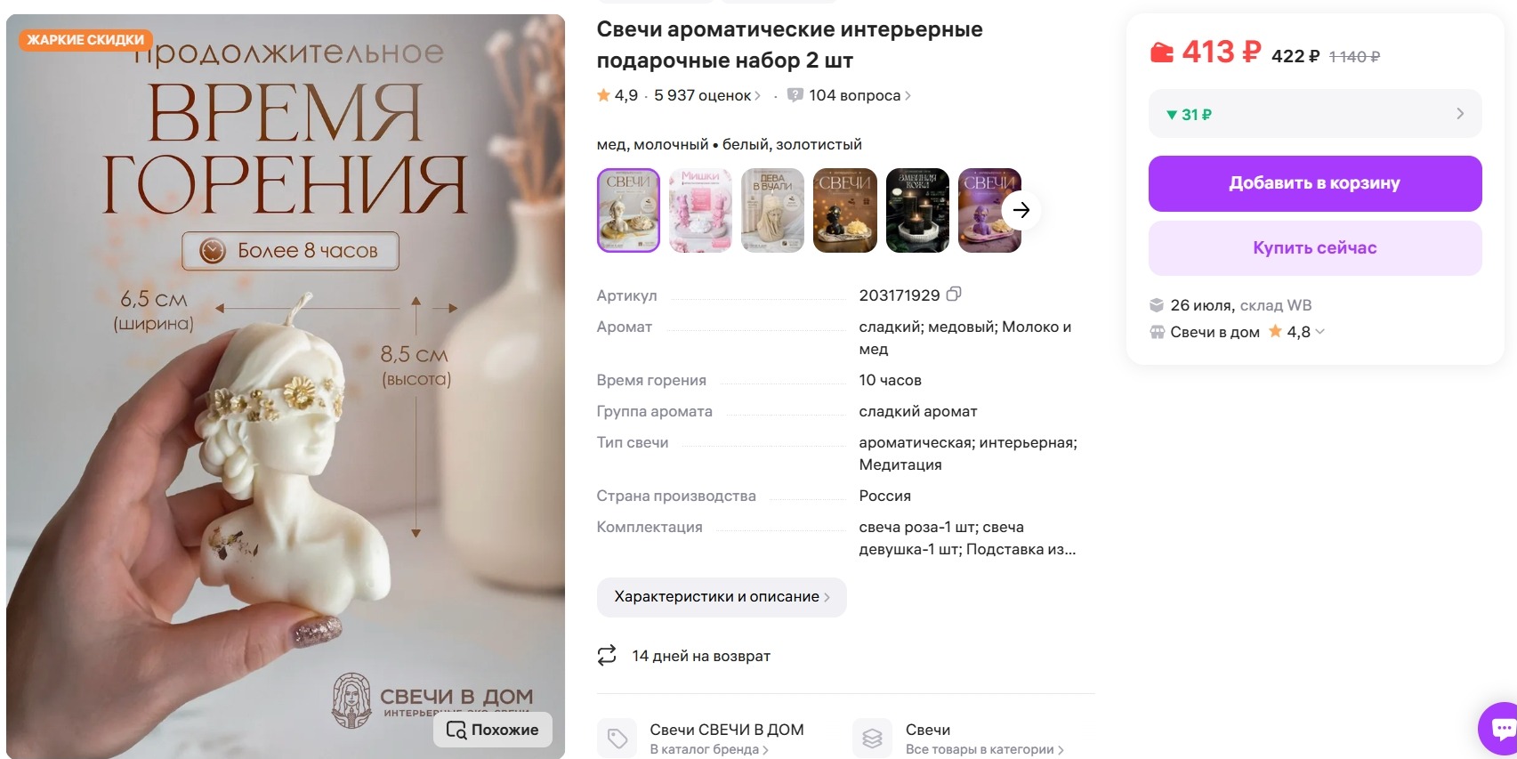 Допустим, покупателям нравятся эстетичные свечи с приятным запахом. Они продаются с подставками, а вот подставки вызывают негатив — они не покрыты лаком, поэтому воск в них впитывается, их нельзя использовать в дальнейшем. Вы можете продавать такие же свечи, но с подставками, покрытыми лаком. Тогда в карточке товара важно описать такое преимущество, и продублировать его в иллюстрациях.