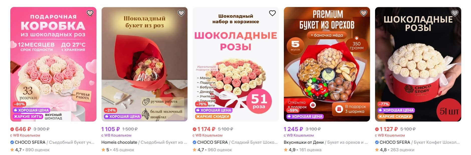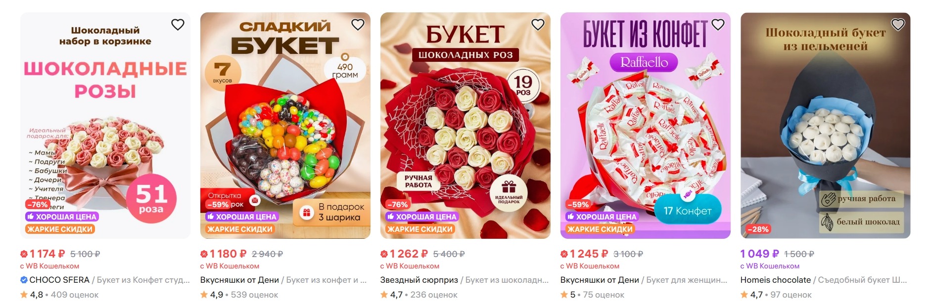 Давайте для примера посмотрим, какие съедобные букеты есть на маркетплейсах. Открываем сайт Wildberries, вводим запрос и получаем такой результат ↓