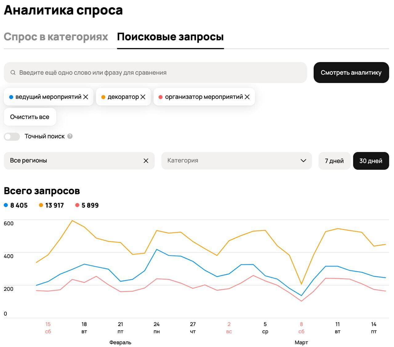 Аналитики заметили рост спроса на ведущих, организаторов декораторов. Это подтверждают и запросы на Avito. Пользователи действительно ищут специалистов, которые помогут создать праздник. Вот пример аналитики спроса с февраля по март 2025 года.