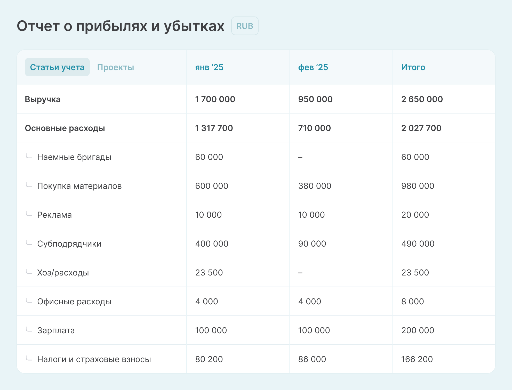 Однако для понимания прибыльности проекта или деятельности в целом компания ведет управленческий учет. Вот здесь следует отметить расходы на самозанятых. В Отчете о прибылях и убытках удобно разделить выплаты наемным исполнителям и штатным сотрудникам. Так можно спланировать расходы на будущие периоды.