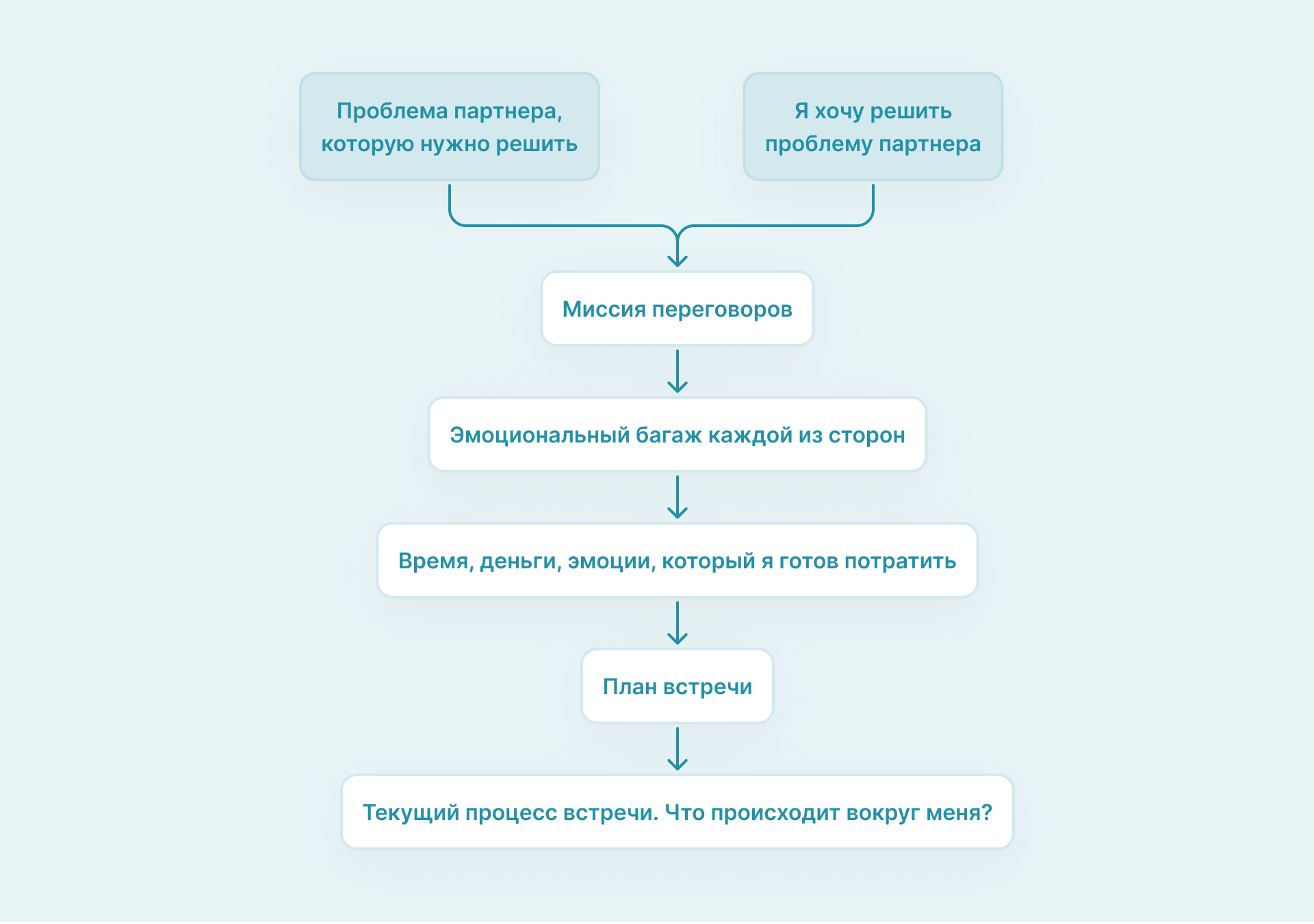 Полезной станет наглядная схема правил деловых переговоров, выстраивания позиции и переговорного процесса.