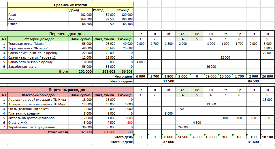 Если у вас небольшой бизнес, несколько клиентов и стабильные расходы, вести учет можно в таблицах. Для этого по дням расписывают доходы и расходы, можно сделать таблицу для нескольких проектов или торговых точек. Также сводят информацию об итоговом количестве доходов и расходов за месяц. На это будет уходить много времени, так как нужно не забывать фиксировать все показатели, желательно день в день.