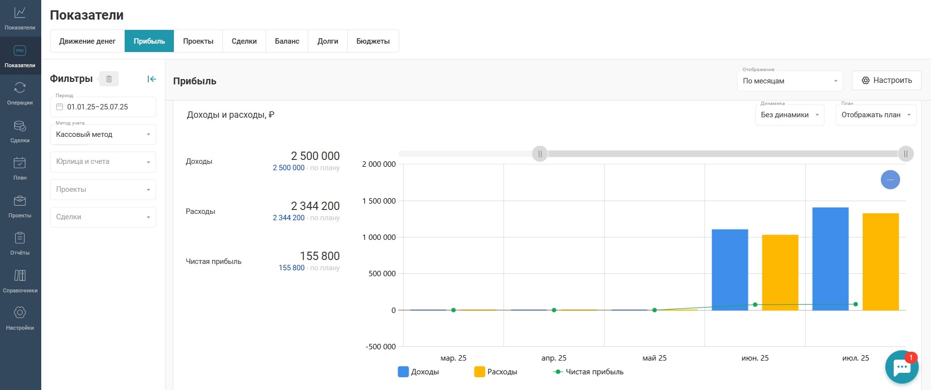 Если источников доходов много, расходы меняются, и вы хотите тратить минимум времени на учет, используйте сервисы, которые автоматически фиксируют все данные. Например, в сервисе Планфакт есть интеграции с банками, CRM-системами, чтобы не вносить цифры в таблицы вручную. Здесь вы сможете контролировать чистую прибыль, доходы и расходы, рентабельность разных проектов, сделок.