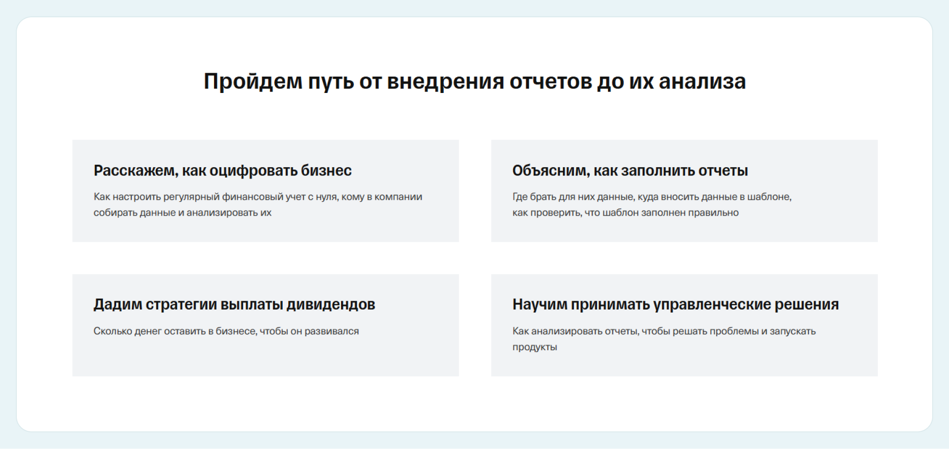 Например, с помощью системы планирования предприниматель может откладывать нужные суммы в зарплатный фонд, на налоги и маркетинг. Именно такую систему планирования внедрили в онлайн-школе йоги. Совместно с контролем рентабельности проектов, автоматизацией финучета это позволило снизить стресс собственника, разгрузить его время и навести порядок в финансах.