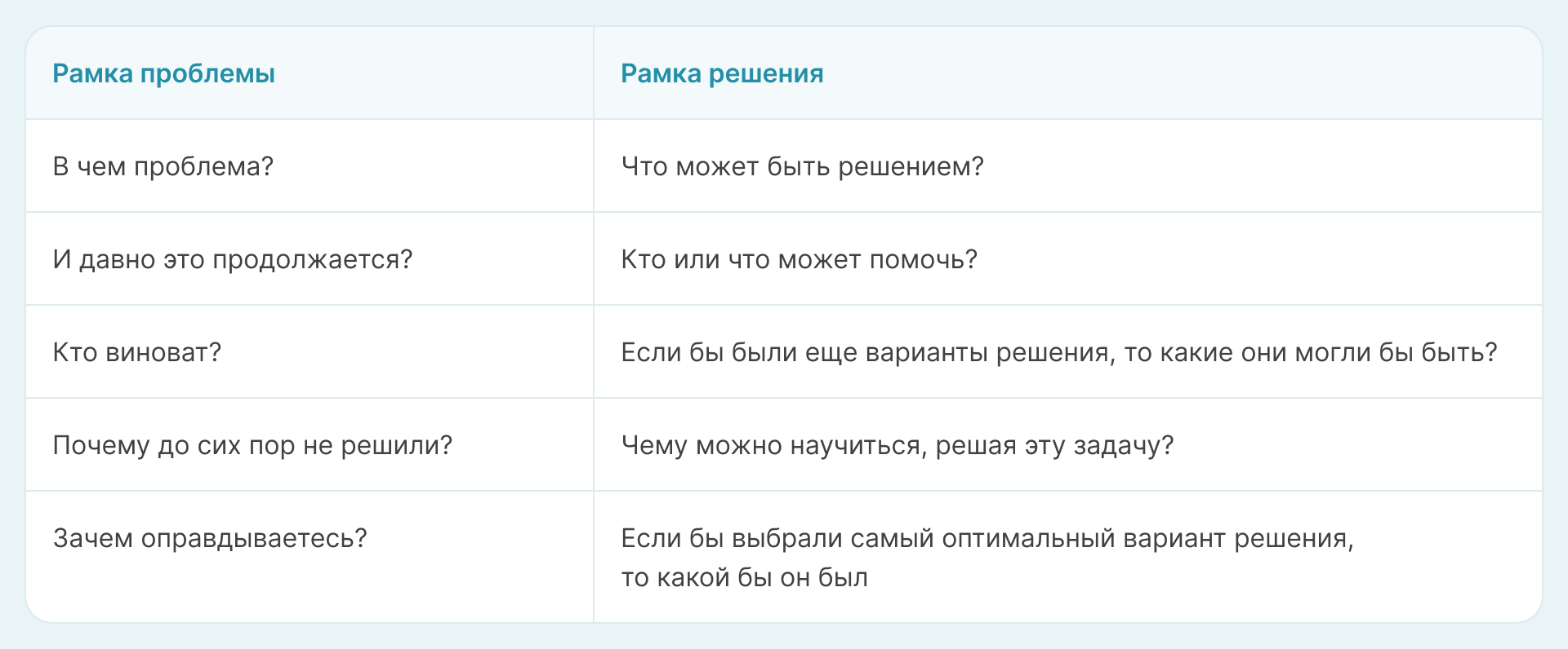 - Задавать себе вопросы, чтобы найти решение проблемы. Есть вопросы, которые только глубже погружают в тревогу. Например, почему эта ситуация произошла, кто в этом виноват? Важно научиться переключаться с таких вопросов на другие — те, что помогут решить проблему. Для этого нужно поочередно задать себе вопросы из «рамки решения» ↓