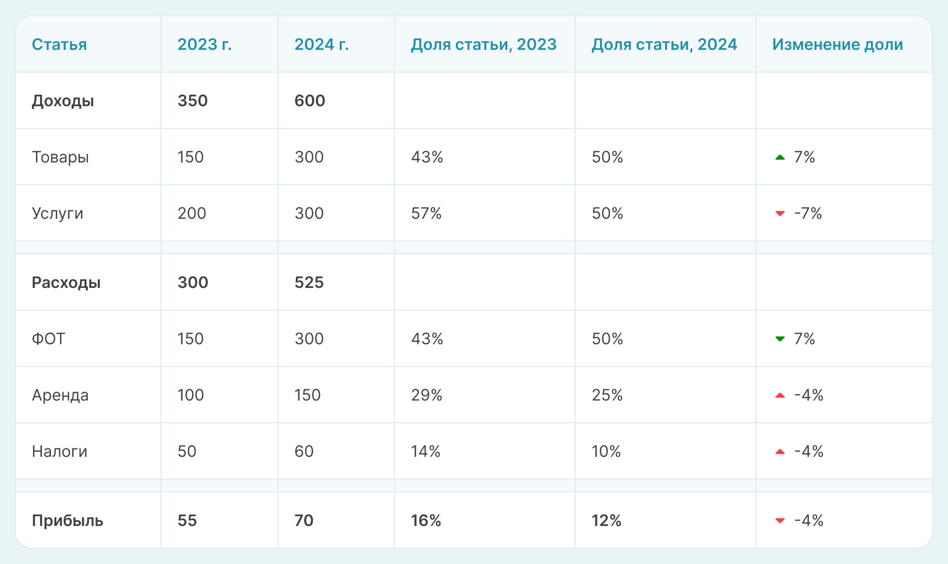 Если в сентябре 2023 года выручка компании составила 1 миллион рублей, а в сентябре 2022 года — 800 тысяч рублей, то можно сделать вывод о росте на 25%. Это может свидетельствовать о положительных изменениях в бизнесе, таких как увеличение клиентской базы или успешные маркетинговые кампании. Конечно, сделать такие выводы из анализа только одного показателя невозможно. Обязательно нужно проанализировать все доходные и расходные статьи и только потом делать выводы исходя из комплексных данных сравнения.