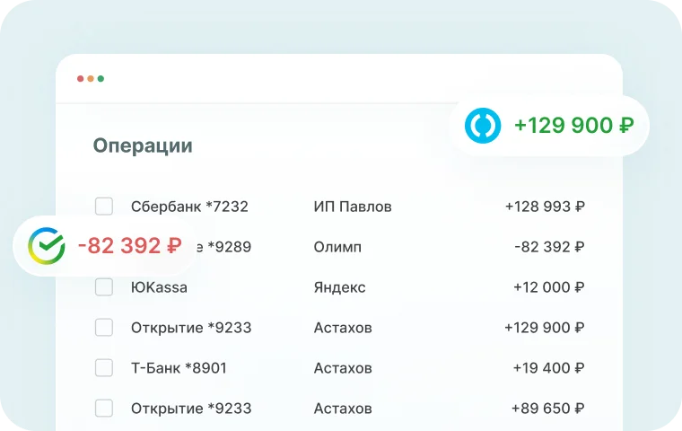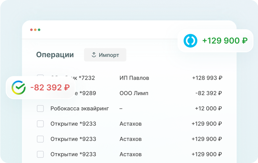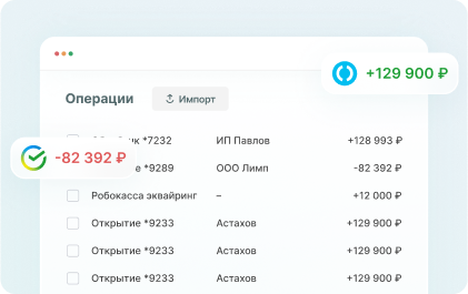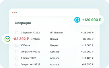 Импортируйте данные о поступлениях и выплатах из «1С:Бухгалтерии» или «1С:УНФ». Все операции