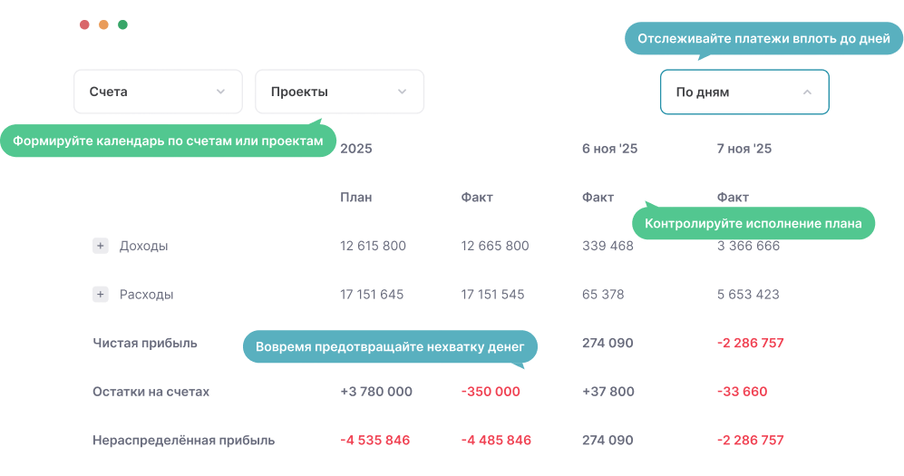 ПланФакт автоматически рассчитает, сколько денег будет на счетах каждый день. Еще до того как совершите платежи